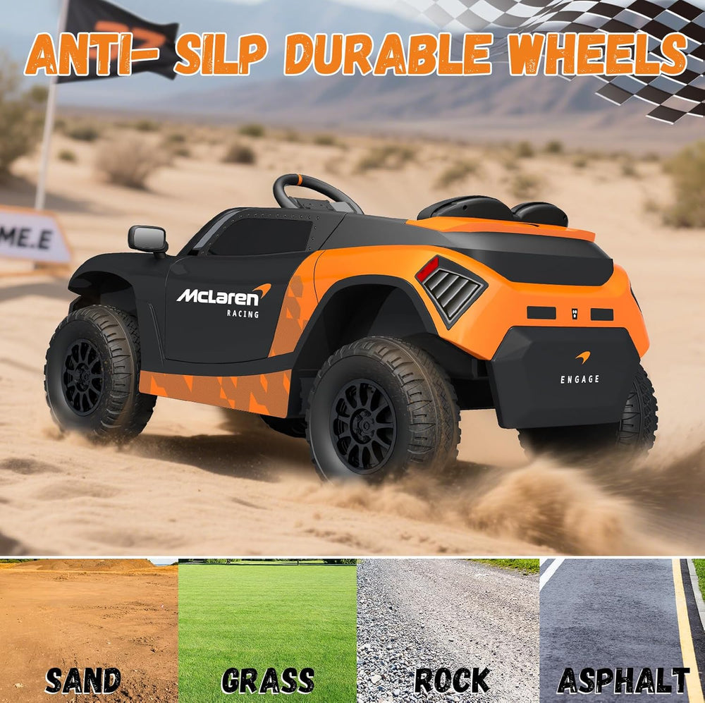 - 1.【Officially Licensed McLaren Racer】- Driving this officially licensed kids' McLaren racing replica, your boys or girls will feel like a “Racing Pro Driver”, experiencing authentic racing DNA. Featuring McLaren's legendary papaya spark orange livery and official decals make your little one the center of attention on the streets and deliver an amazing first-time racing experience.
