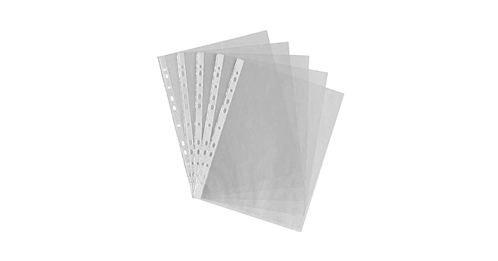 Pack of 100 A4 transparent sheet protectors with 11 punched holes.