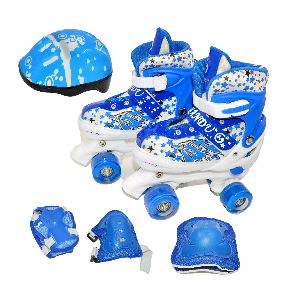 - The Adjustable Roller Skates set features flashing wheels and an adjustable size for both indoor and outdoor use. Available in pink, red, and blue, these skates come in three sizes (L, M, S) to fit children of all ages and genders. Get ready to glide and roll your way to fun and excitement with these vibrant and versatile skates!