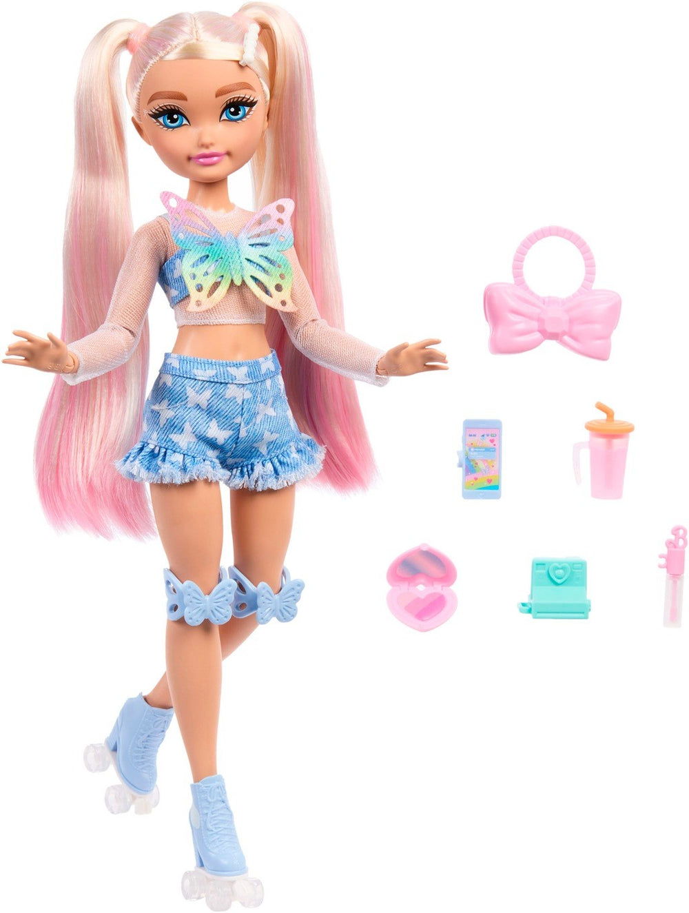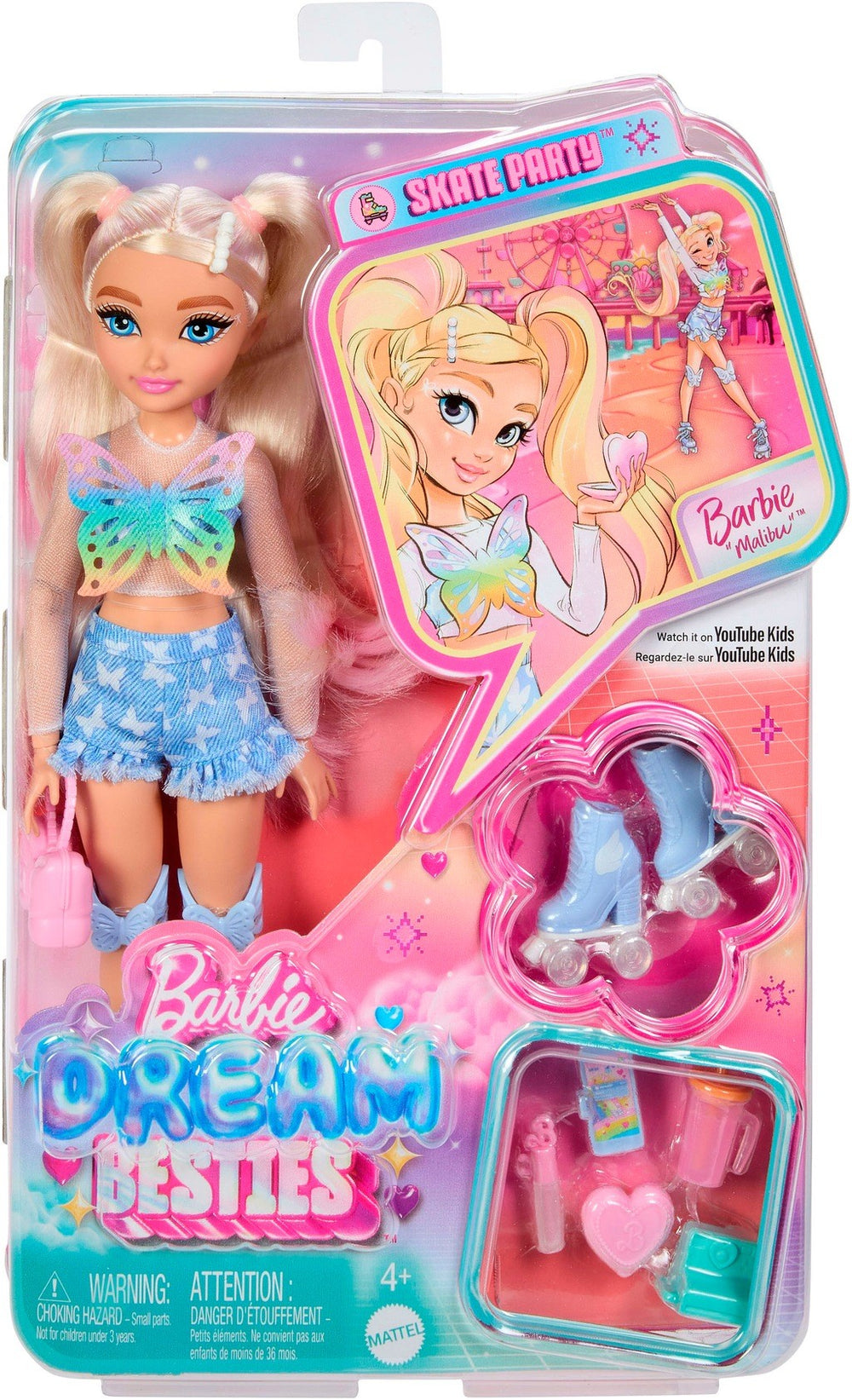 The Barbie Dream Besties dolls feature their fun-themed accessories that match their new hobby.roller skating! BARBIE™ and associated trademarks and trade dress are owned by, and used under license from, Mattel. ©2024 Mattel. FEATURES: The Barbie Dream Besties Barbie 'Malibu' loves to roller skate Watch her skate in her detailed outfit with fun-themed accessories!, Barbie 'Malibu' is chasing her dreams of owning her own makeup company! She comes with themed accessories, like her lip gloss, heart-shaped mirror compact, bow purse,, butterfly kneepads, camera, a drink, and a phone., The doll is posable and is wearing removable fashions, like her sparkle butterfly top layered over a sheer white long sleeve, butterfly-patterned denim shorts with a peplum hem, and her matching blue roller skates with wing details!, Barbie 'Malibu' doll features long blonde, styled in two pigtails with a pearl hairpin, with pink-ombre tips to show her expressive personality!, The doll set makes a great gift for kids 4 years old and up, especially those who love styling and storytelling! WHAT'S INCLUDED: Includes 1 Barbie Dream Besties doll wearing removable fashions, roller skates and 1 lipgloss, 1 purse, 1 compact,, 1 camera, 1 drink, and 1 phone. Doll cannot stand alone. Colors and decorations may vary. DETAILS: Age: 4 years & up, No assembly required, Batteries Not Required, Spot clean, 12.75 Inches x 8.5 Inches x 2.37 Inches, Plastic, JFX96, Imported, No warranty, 1.02 lbs. Size: One Size. Gender: female. Material: NONE.