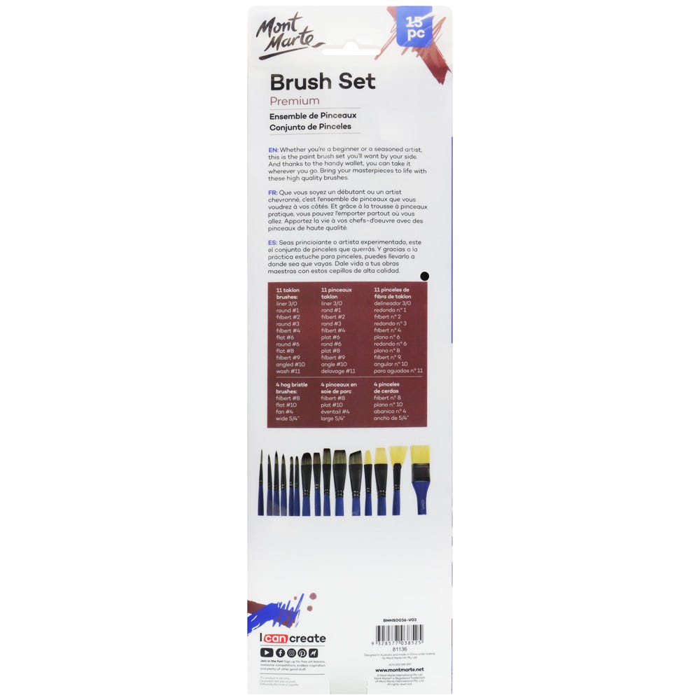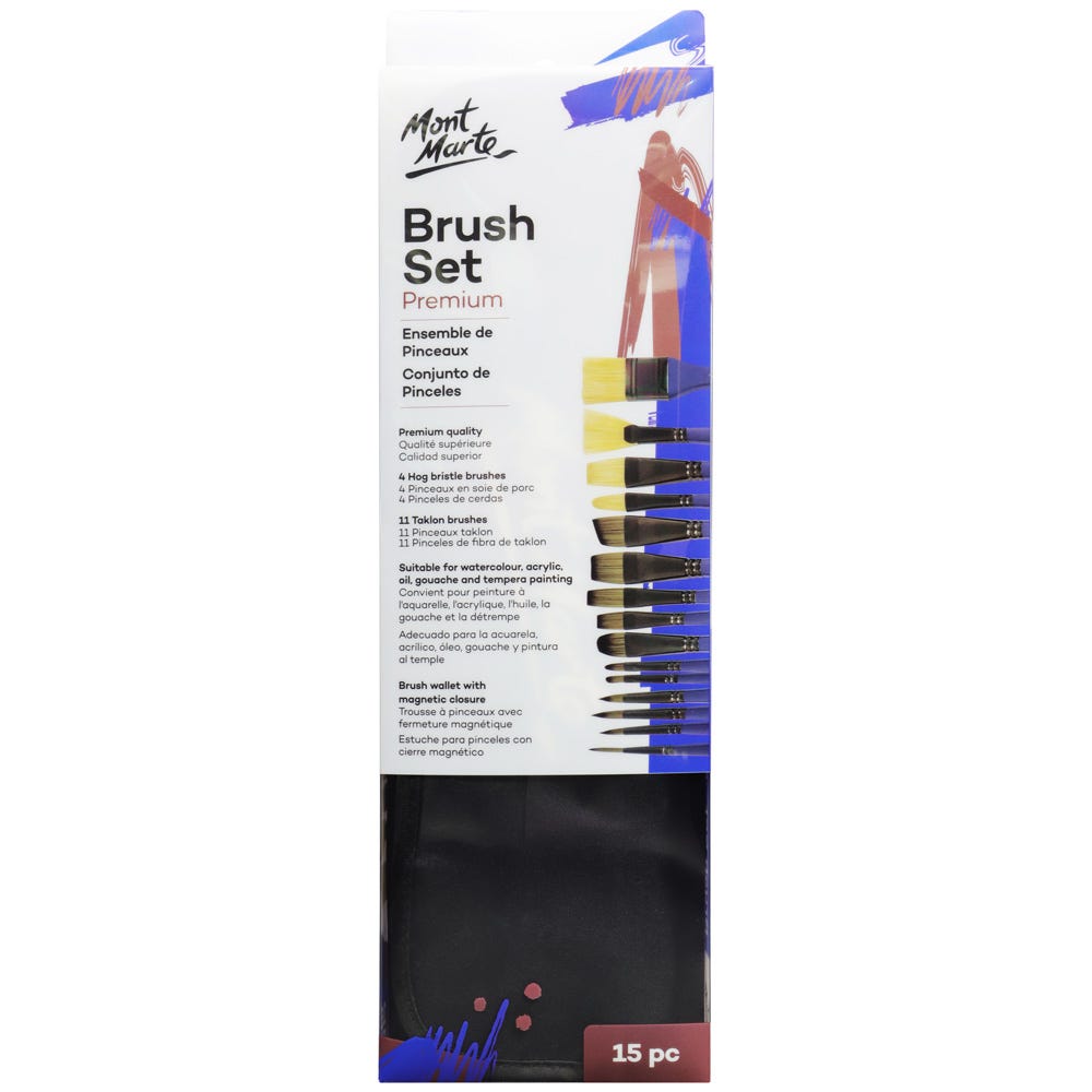Transform your paintings into masterpieces with the Mont Marte Brush Wallet Set Premium 15Pc. No matter your artistic style, this must-have set of brushes will elevate your work to the next level. And with its convenient wallet design, you can easily bring it with you wherever you go. Unleash your creativity with the exceptional quality of these brushes.