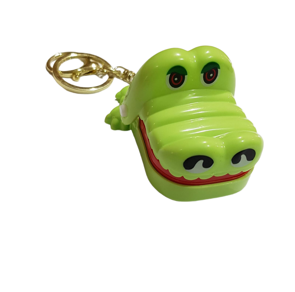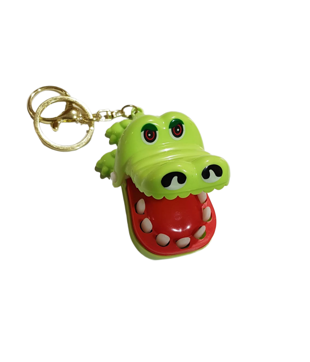 This novelty keychain features a crocodile mouth with snap-close biting teeth. A fun interactive toy and cool accessory all in one.