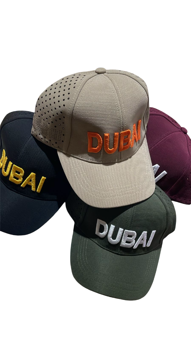Stylish Dubai souvenir caps featuring scenic prints. Multiple assorted designs. Sold individually.