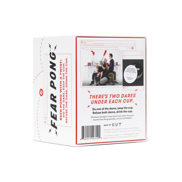 - WHAT'S INSIDE: (1) 100 outrageous & waterproof dare coasters with 2 dares on each coaster (200 dares total). (2) twelve blank coasters to write your own dares and (3) two red ping pong balls emblazoned with the Fear Pong logo.