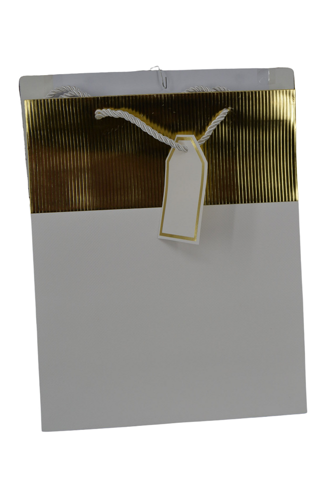 Elegant white and gold gift bag perfect for birthdays, weddings, or special events. Durable with rope handles.