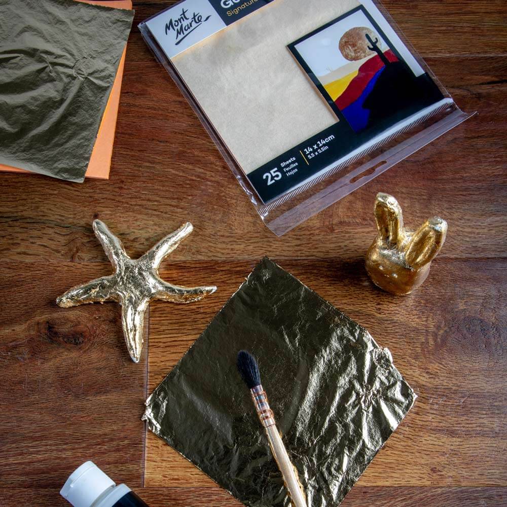 Enhance the look of your paintings, sculptures, leather goods, metal work, glass, and picture frames by incorporating the age-old technique of metal leaf gilding. Let your imagination run wild and discover the endless possibilities with the Mont Marte leaf products.