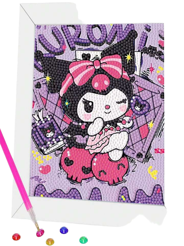 A 40x50cm diamond painting kit that features the character Kuromi, a favorite from Sanrio. The set includes diamonds that are placed on a sticky canvas to create a glittering, vibrant image of Kuromi. It’s a fun and creative activity for both kids and adults, allowing them to make their own sparkling artwork.