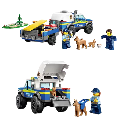 The LEGO City Police Animal Set "Mobile Police Dog Training" (60369) is a great police toy that will delight children and dog lovers alike. The dog unit's SUV, trailer, and three pieces of dog training equipment (seesaw, jump obstacle, and paw pads) allow your child to play with their imaginations. All that's missing are the police officers and toy dogs, including a police dog and puppy, so the fun can begin with this toy for children aged 5 and up.