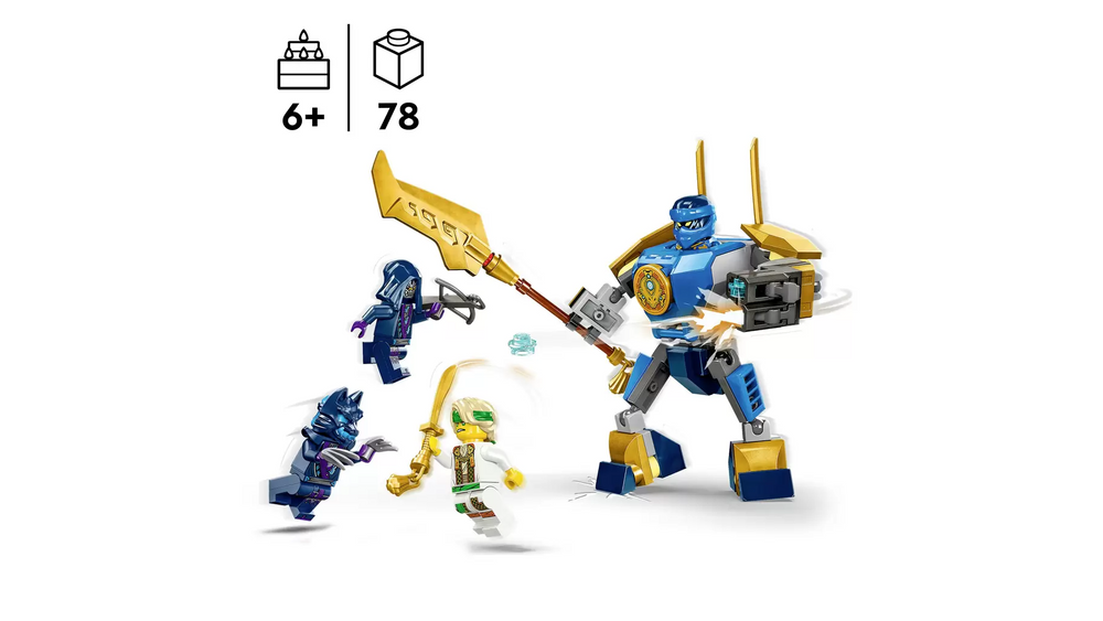 Fans can play out all-action battle scenes from season 2 of the LEGO NINJAGO Dragons Rising TV show with this Jays Mech Battle Pack (71805) adventure toy. This ninja toy for 6+ year old boys, girls and kids features a cool mech action figure with posable arms, legs and torso that wields a large golden sword and can fire studs from its 2 shooters.This ninja toy for kids is packed with 4 LEGO NINJAGO characters and lots of accessories. Jay is armed with a golden sword and the Master Lloyd LEGO NINJAGO minifigure has 2 golden katana swords. The Wolf Mask Claw Warrior has a long set of claws on each hand and the Wolf Mask Guard comes with a crossbow.The rest of the range of LEGO NINJAGO sets for kids includes toy dragons, vehicles, temples and action figures so fans can role-play adventures with their heroes. Each ninja toy set can be created with the LEGO Builder app, which guides you and your child on an easy and intuitive building adventure. Zoom in and rotate models in 3D, save sets and track your progress. This set makes a fun gift for 6+ year old boys, girls and kids who are fans of the LEGO NINJAGO Dragons Rising TV show. Action-packed mech suit toy for kids Kids 6+ reenact season 2 of the LEGO NINJAGO Dragons Rising TV show with Jays Mech Battle Pack ninja toy Posable mech action figure The mech suit has posable arms, legs and chest, holds a large golden sword and can fire studs from its 2 shooters 4 LEGO NINJAGO minifigures The role-play toy includes Jay, a unique Master Lloyd minifigure, a Wolf Mask Claw Warrior and a Wolf Mask Guard Weapon accessories NINJAGO Jay has a golden sword, Master Lloyd has 2 golden katana sword elements, and the Wolf Mask Guard has a crossbow Ninja small gift idea This ninja toy is a fun build-and-play experience and a gift for 6+ year old boys, girls and kids who love NINJAGO figures Bigger ninja adventures Look out for more LEGO NINJAGO sets (sold separately) featuring mech action figures The mech suit toy stands at over 8 cm (3 in.) tall Contains 78 Pieces.
