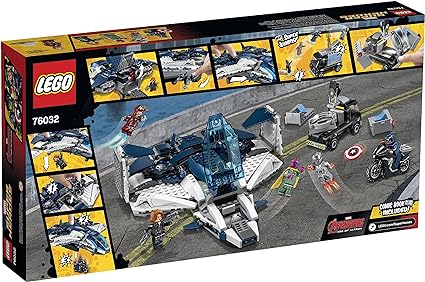 The Quinjet features an opening cockpit with translucent windscreen, 4 stud shooters, opening rear hatch, opening roof, detailed cabin, foldable wings, secret wing compartment to launch Avenger attacks, Captain America bike with secret release button, and a rope to attach any object to the Quinjet