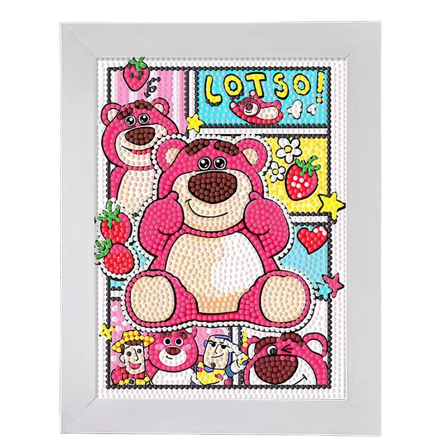 A 40x50cm diamond painting kit featuring Lotso Bear, a character from the Toy Story franchise. This crafting kit allows users to place colorful rhinestones on a pre-printed canvas to create a sparkling, vibrant image of Lotso. Ideal for fans of the character and those who enjoy detailed crafting activities.