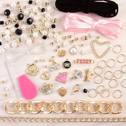 EVERYTHING INCLUDED. This bracelet kit has everything your child needs to create up to 5 bold bracelets. Includes 12 Juicy Couture charms, beads, metallic pieces, ribbon, chains, and instructions