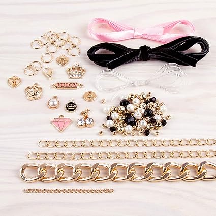 PERFECT FOR AGES 8+: The Juicy Couture Mini Chains and Charms kit includes everything your child needs to create fun and fashionable bracelets including 10 Juicy Couture charms, 99 beads, pink & velvet ribbon, clear thread, 4 chains, and a workstation!