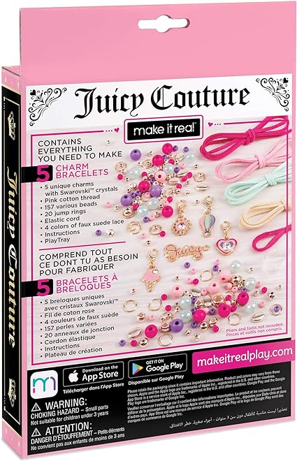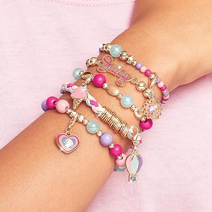 EASY TO MAKE, FUN TO WEAR: Making stylish Juicy Couture bracelets is simple with this DIY girls jewelry making kit! It has everything girls will need to make up to 5 dazzling bracelets, including cute Juicy Couture charms, various beads & plenty of cord & thread