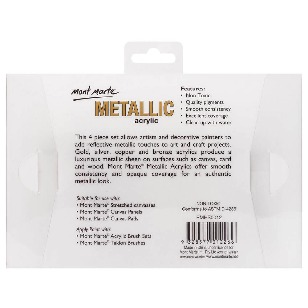 Ready to infuse your masterpieces with captivating metallic brilliance? Dive into the magic of the Mont Marte Metallic Acrylics 4-Pc Set – your gateway to shimmering landscapes, radiant portraits, and creations that dance with light like liquid jewels!
