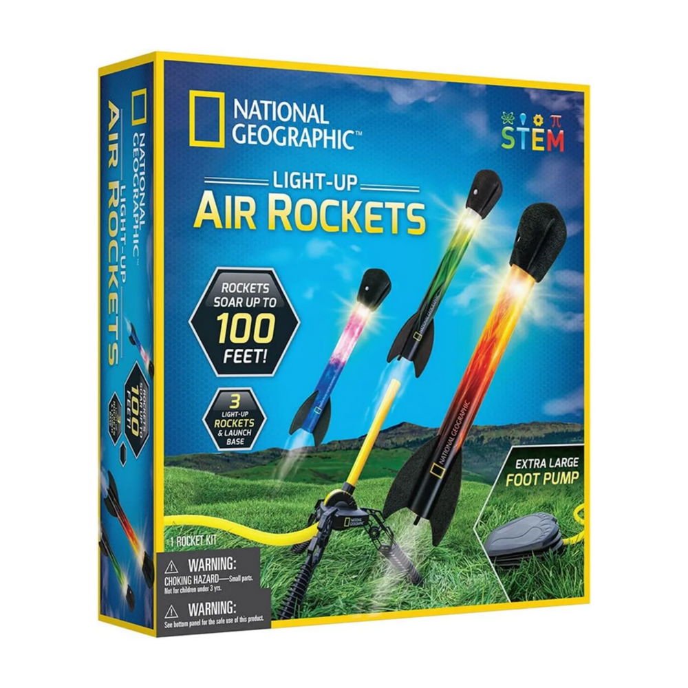 - Includes 3 Light-Up Air Rockets, Launch Base and Foot Pump