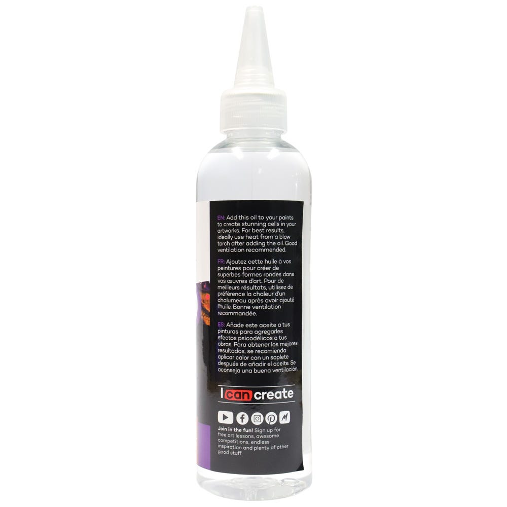 Unlock your artistic potential and achieve striking and unique effects with our Premium Silicone Oil. By simply adding it to your pouring paints, you can create stunning cells and patterns on your canvas. Our formula is specially designed to work with a maximum of 2-3 teaspoons per 200ml (6.8oz) of paint, ensuring optimal results every time. And don't worry about varnish - just make sure to clean the silicone oil from your painting beforehand. Elevate your pouring art to the next level with our Premium Silicone Oil!