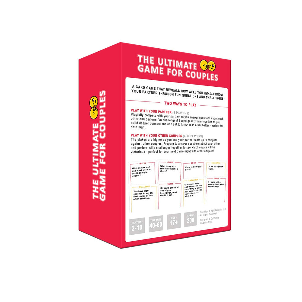 The Ultimate Game For Couples is a fun and engaging game designed to bring couples closer together. Whether you're looking to bond with your partner or have a little fun, this game offers interactive and entertaining challenges. Perfect for date nights, anniversaries, or just spending quality time with your loved one, it’s sure to spark laughter and connection!