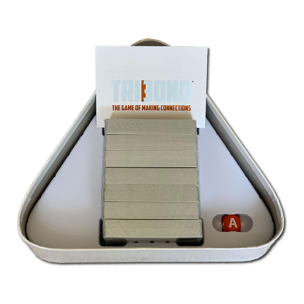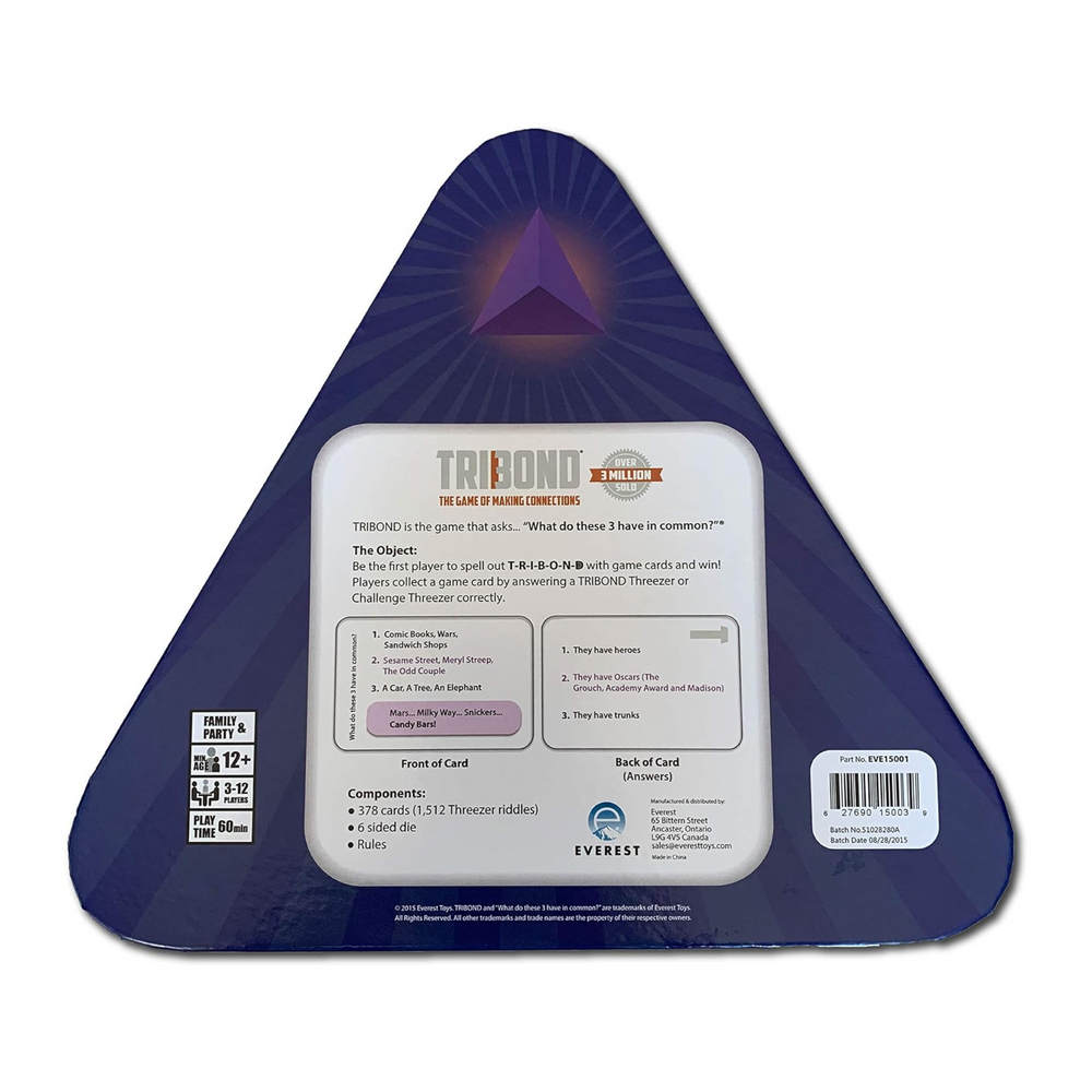 TriBond is the game that asks, “What do these 3 have in common” Be the first player to spell out T-R-I-B-O-N-D with game cards and win. Players collect a game card by answering a TriBond Threezer of Challenger Threezer correctly.