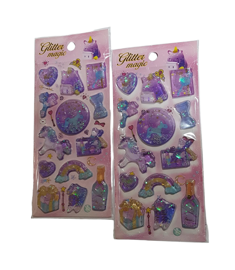These glitter-filled unicorn stickers add shimmer and fun to journals, scrapbooks, and phone cases. Shake them to see confetti move inside!