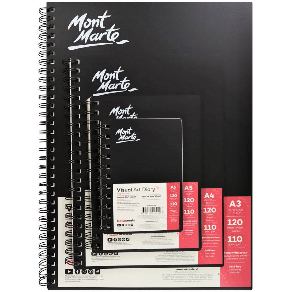 The Mont Marte Visual Art Diary Signature is an A3 size with 120 pages, spiral-bound and reinforced with the heavyweight card for a durable surface. This visual diary is perfect for capturing creative thoughts and is compatible with a variety of dry media. A must-have for artists of all skill levels!