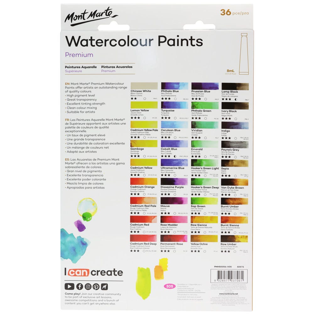 Mont Marte Watercolour Paints Premium 36Pc X 8Ml (0.3 Us Fl.Oz)