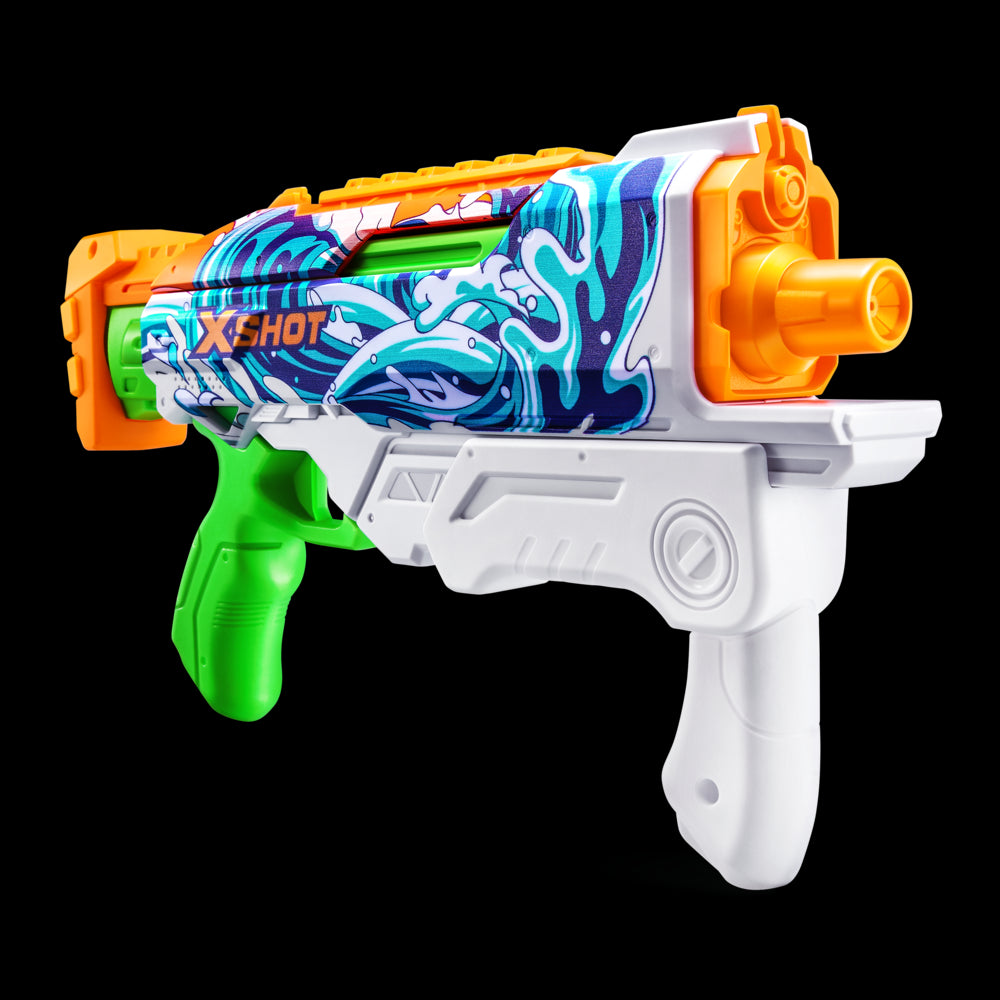 With the X-Shot Fast Fill Skins Hyperload you are ready for summer! The Fast Fill technology allows you to fill the blaster in just 1 second by just pulling back the top of the blaster. The blasters holds 500 ml and shoots around 10 meters far. Styles vary, one supplied at random.
